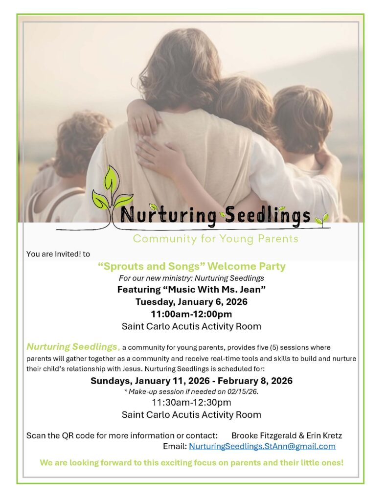 Nurturing Seedlings was designed to help young parents of children ages 0-5 receive the support, encouragement, and skills necessary to help your child develop spiritually. It will also give you the chance to build community with other parents who are in the midst of raising babies, toddlers, and preschoolers. Current research demonstrates that children who grow up with a strong identity of being a child of God are more likely to experience higher levels of emotional well-being throughout adolescence and their entire lives. No matter where you are on your own spiritual journey, even if you’re just beginning, Nurturing Seedlings can benefit your young child and your whole family. (Archdiocese of Hartford)