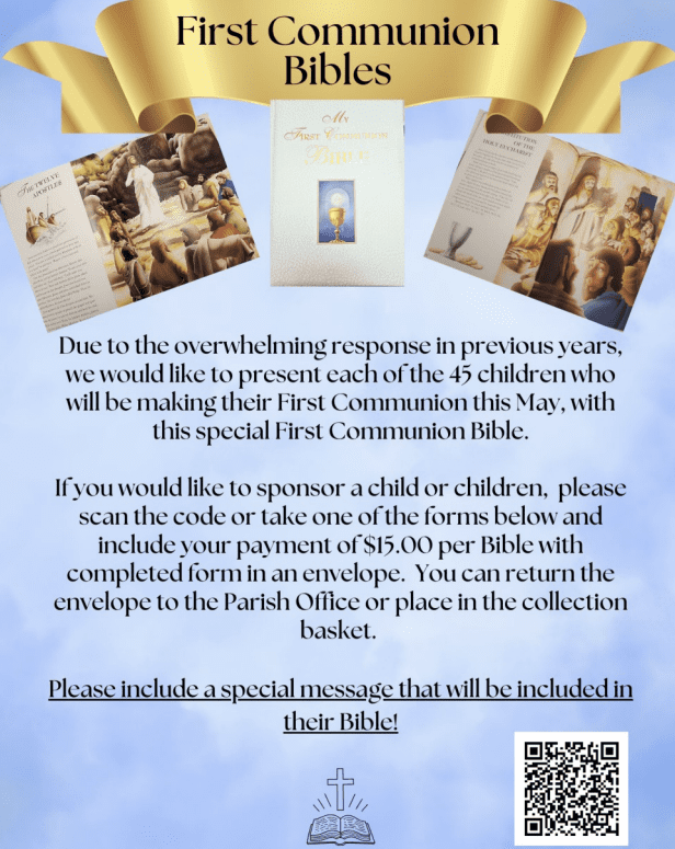 Due to the overwhelming response in previous years, we would like to present each of the 45 children who will be making their First Communion this May, with this special First Communion Bible.