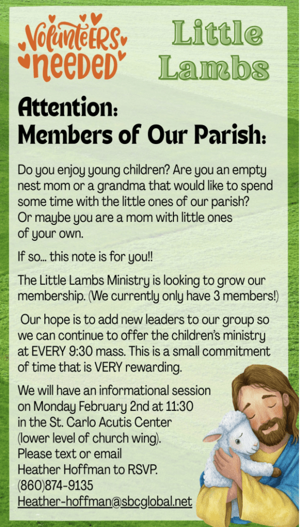 Volunteer Info Session. Monday, February 2nd at 11:30am in the St. Carlo Acutis Center.